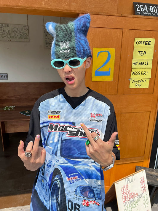 Racing Print V-Neck Mesh T-shirt