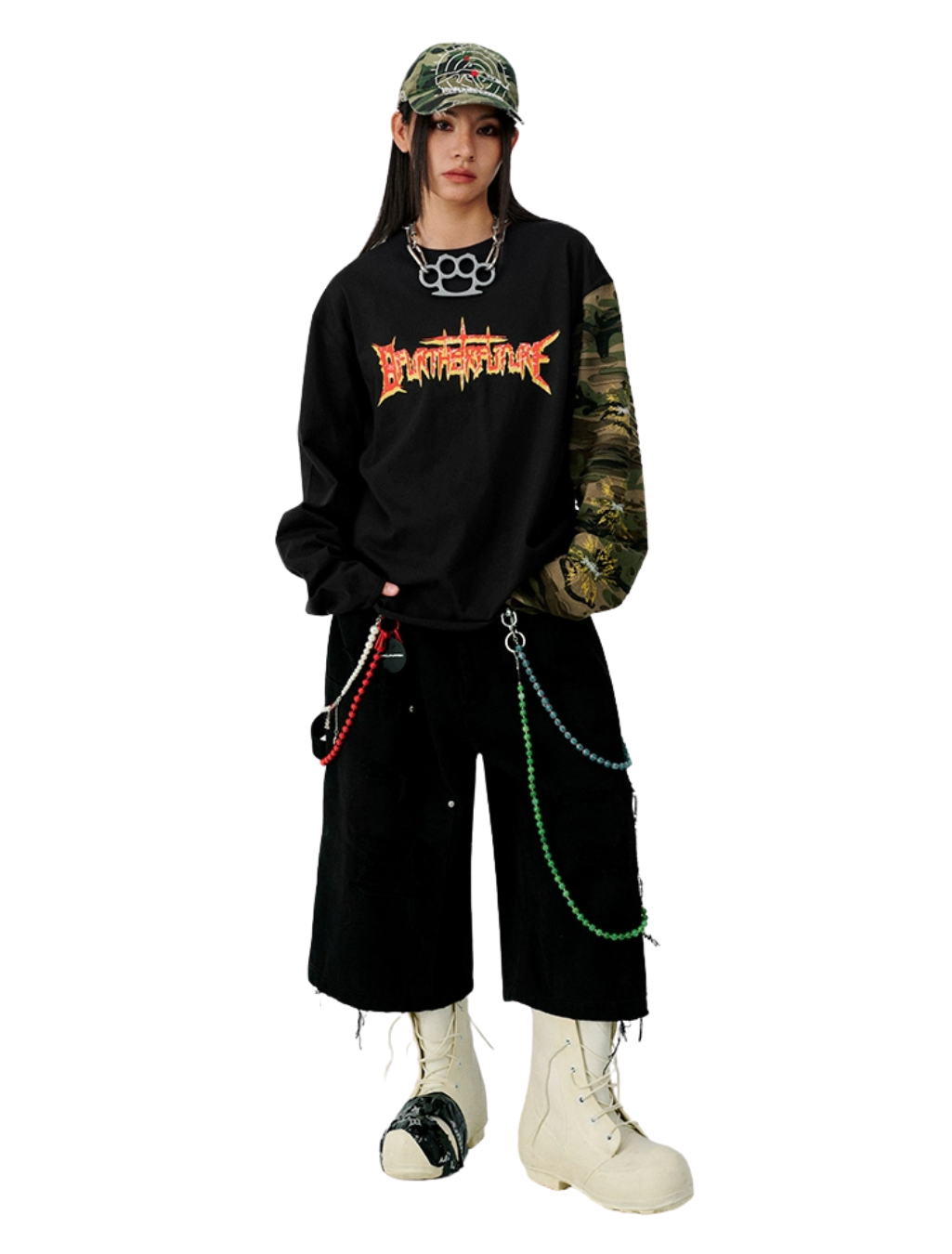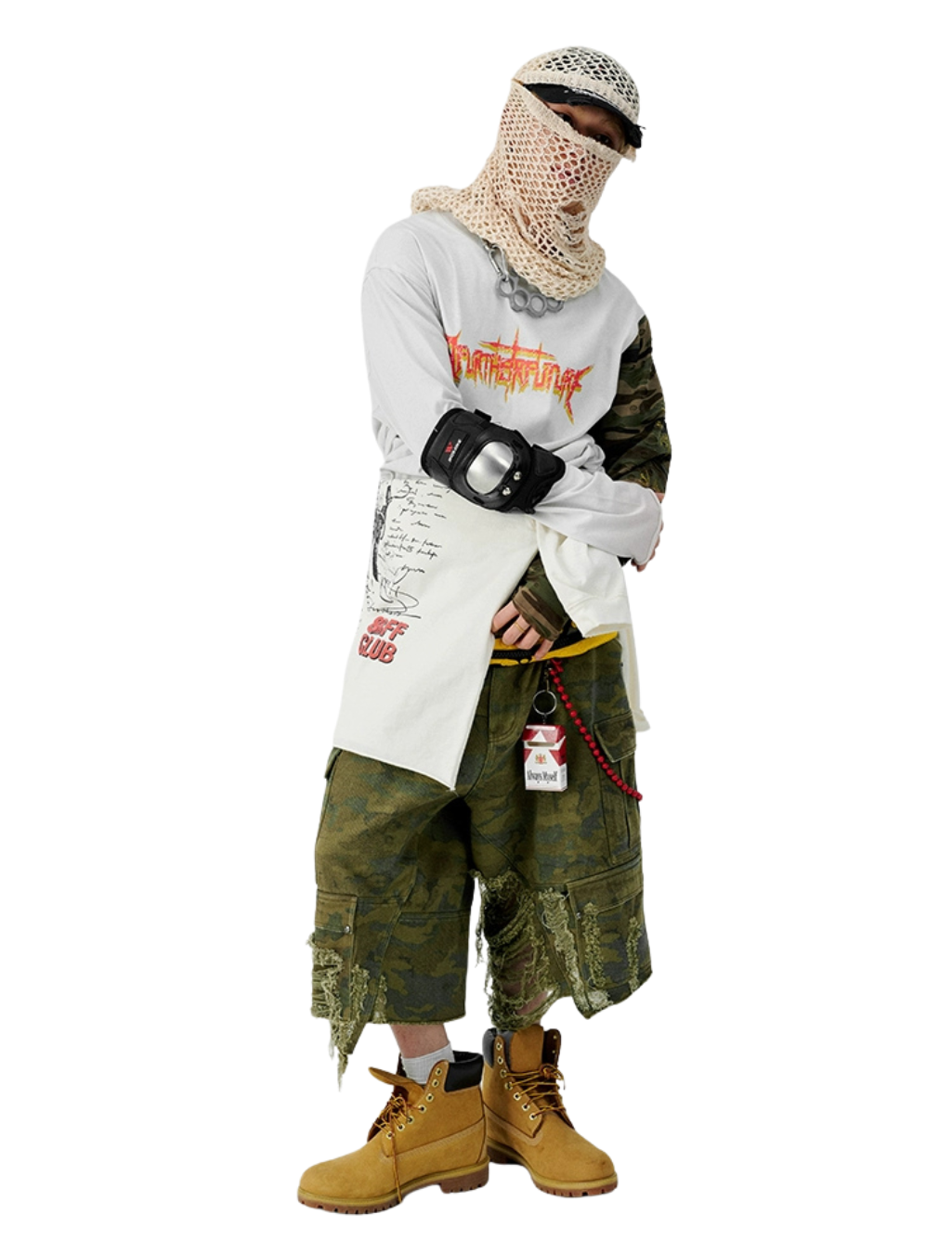 迷彩スプライスとクラックプリントを施したダメージ加工風ロングTシャツ。