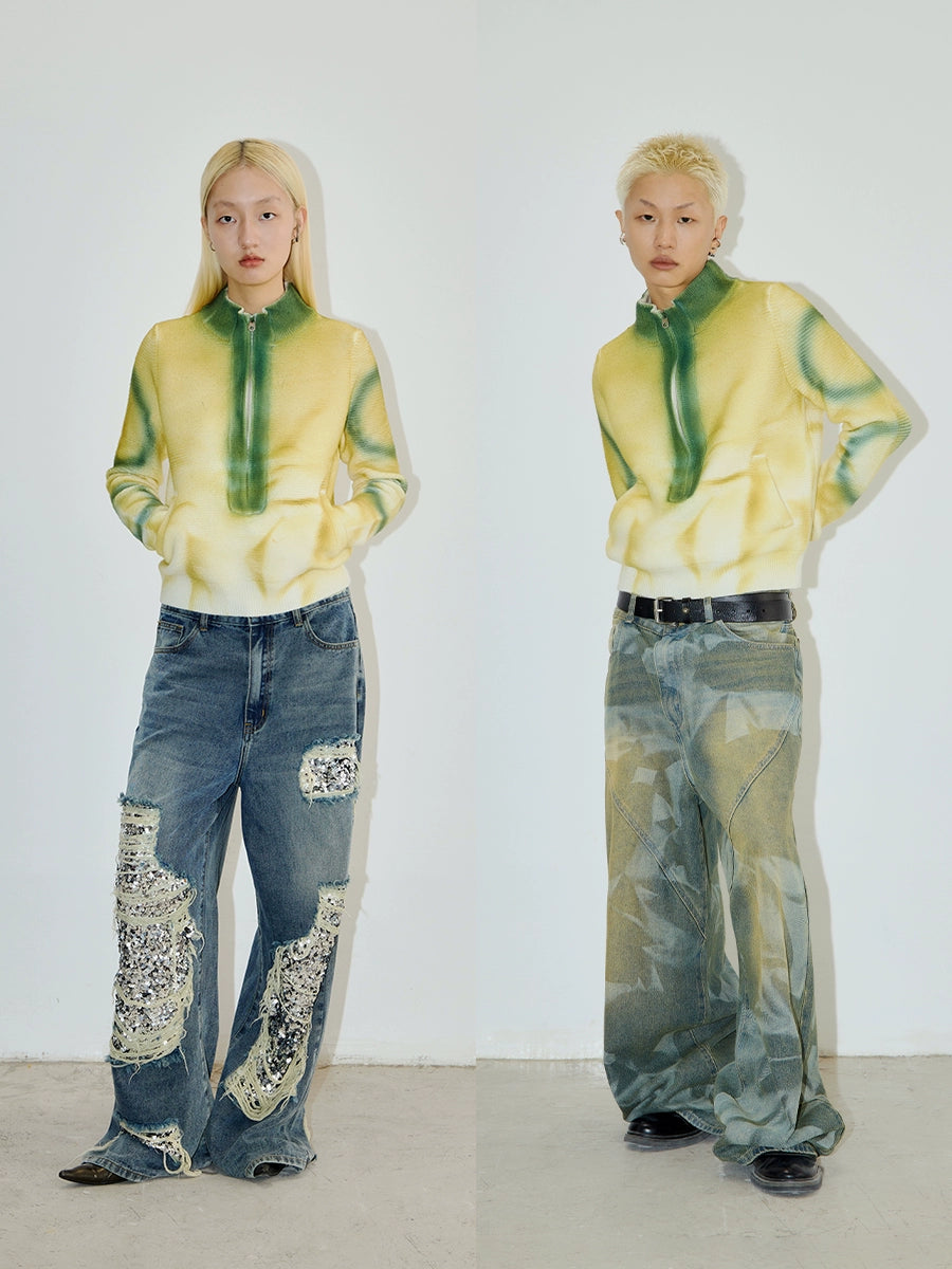 ハンドペイント風のフェード加工を施したハーフジップセーター。