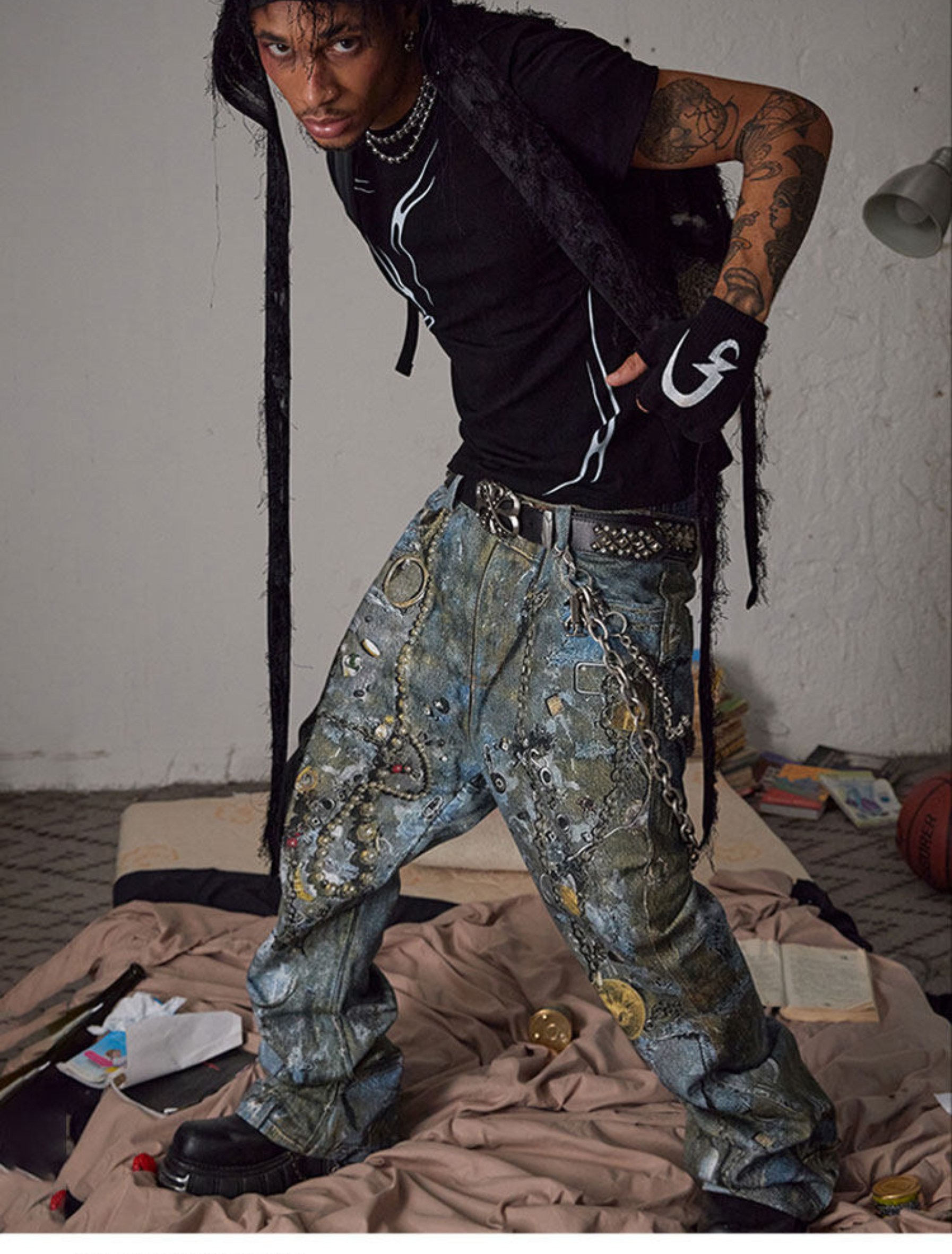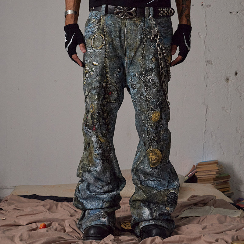 Boro Print Chain-Detail Loose Jeans
