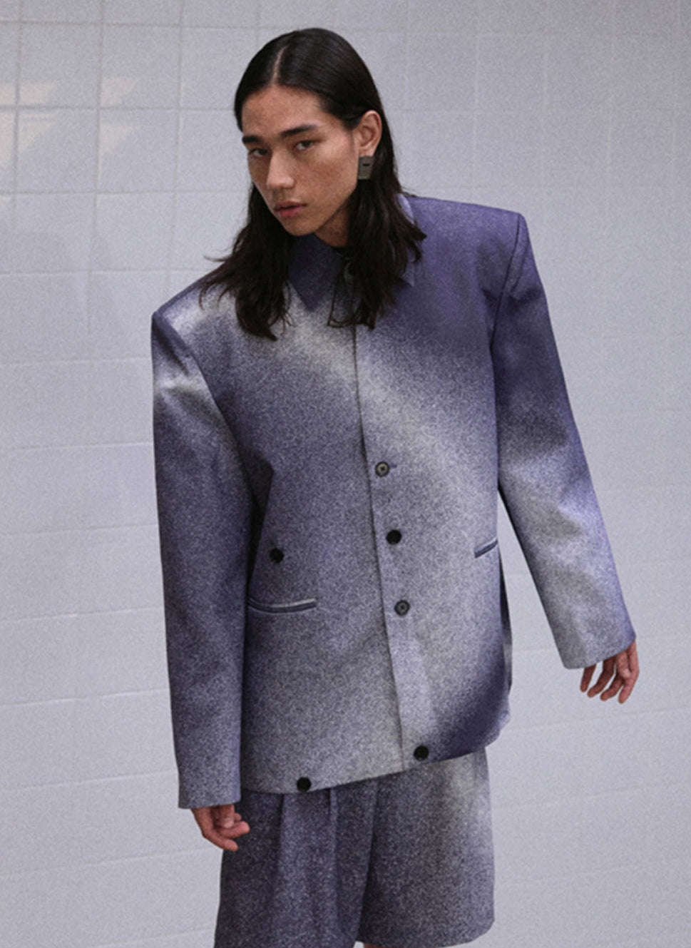 スタンドカラー×ラペルの組み合わせが独自の存在感を演出。
