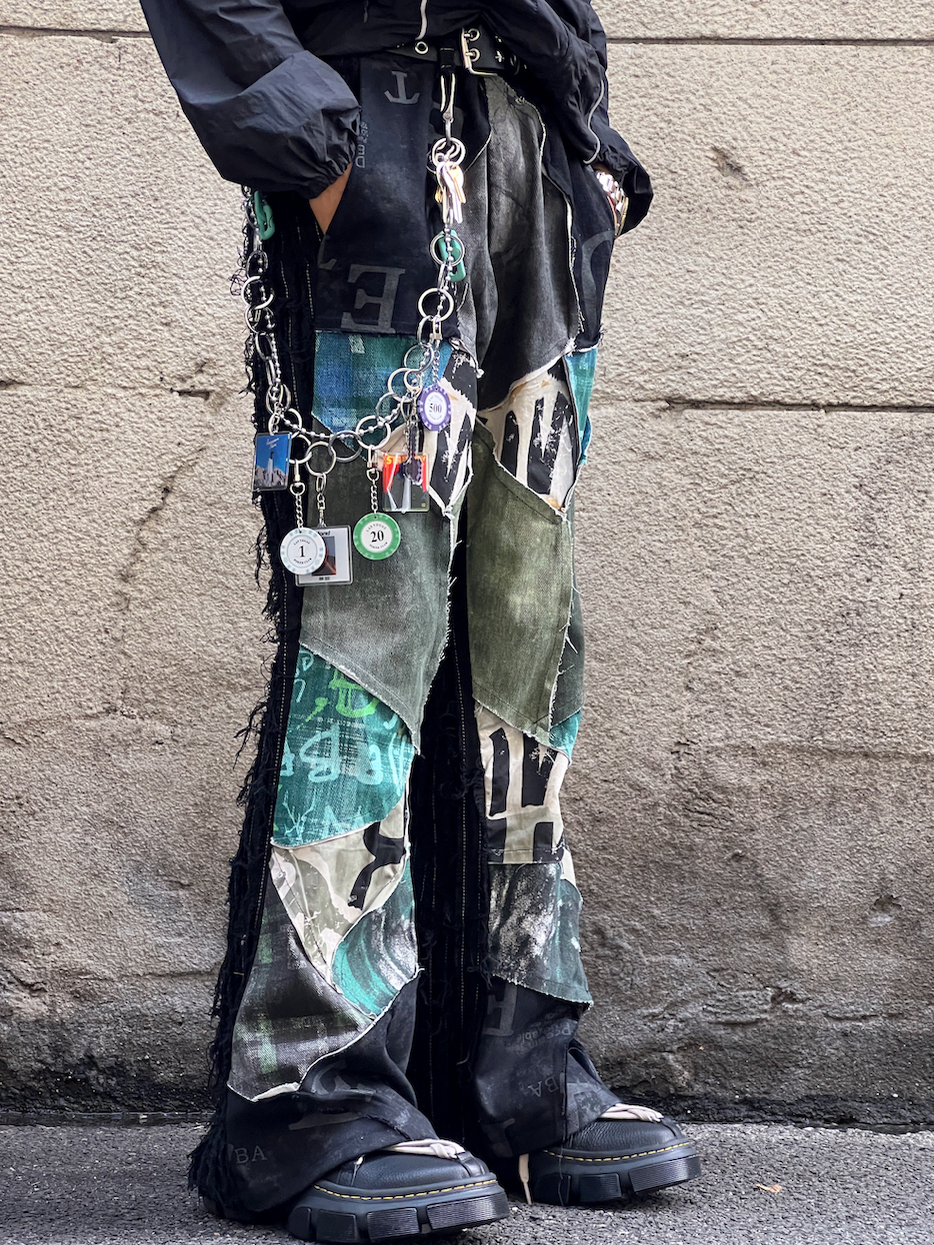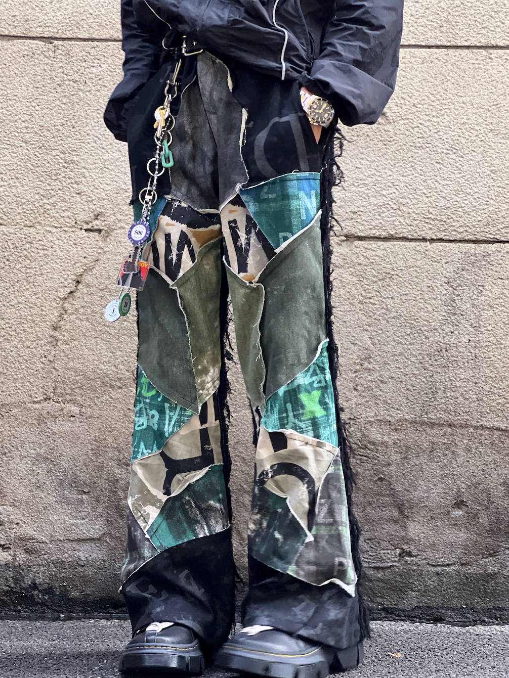 デザイン:グリーンパッチワーク、ブーツカット、スリム&ルーズフィット