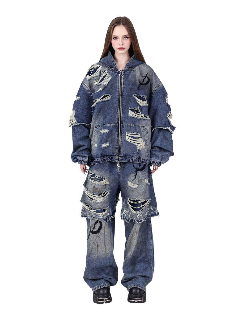 ダブルレイヤー仕様とダメージ加工を施したルーズシルエットのデニムジャケット。