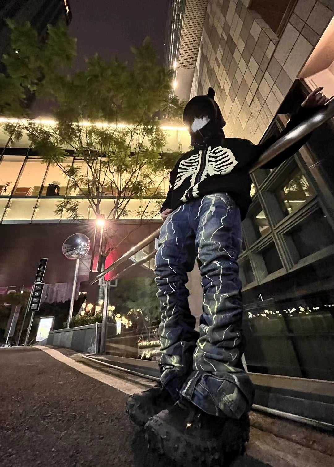・サブカルチャームード漂う稲妻3Dレンダリングデザインのデニムジーンズ。