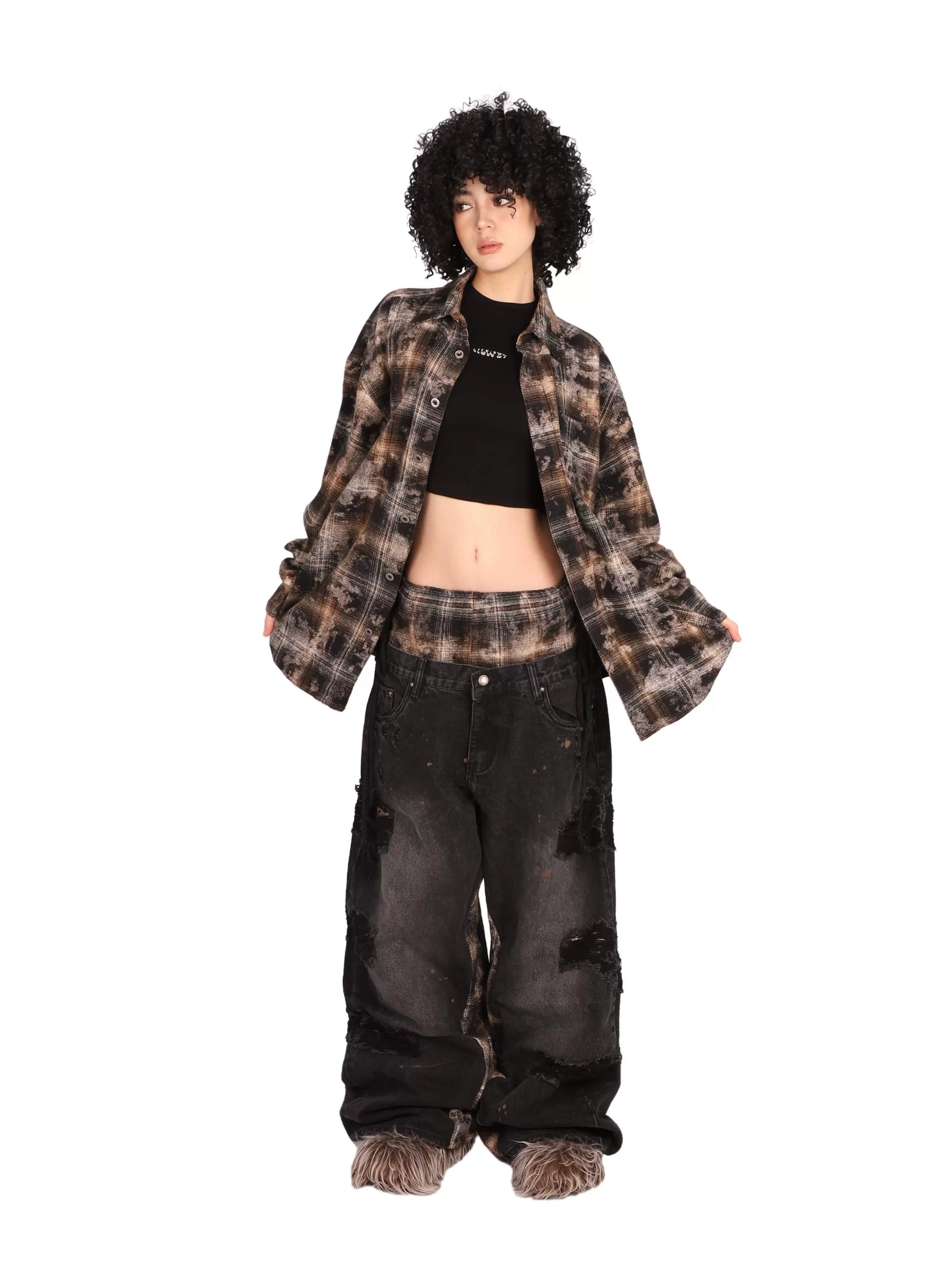デザイン:チェック柄パネル、パッチワーク、リップ加工、ダメージ加工