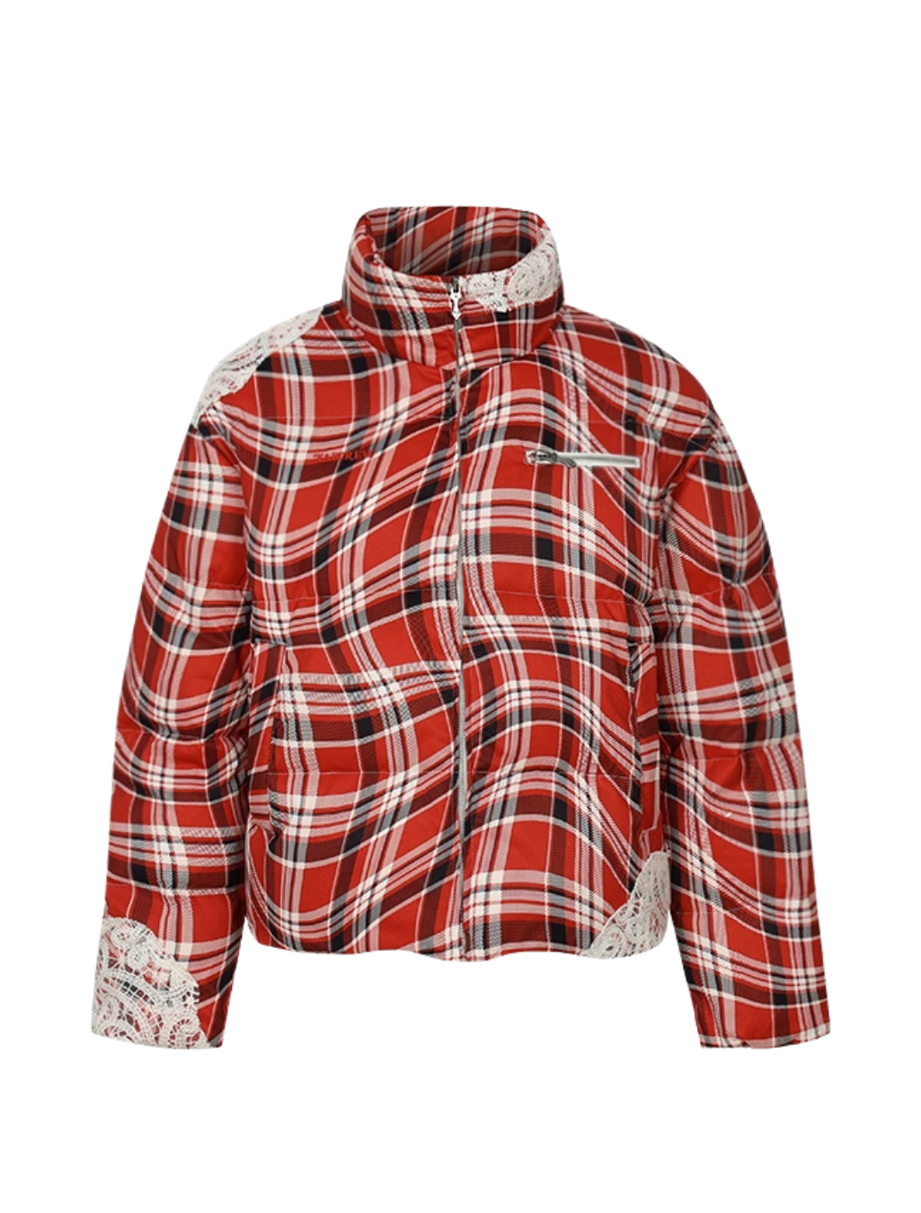 ツイストチェック柄にレース調ディテールを取り入れたスタンドカラージャケット。