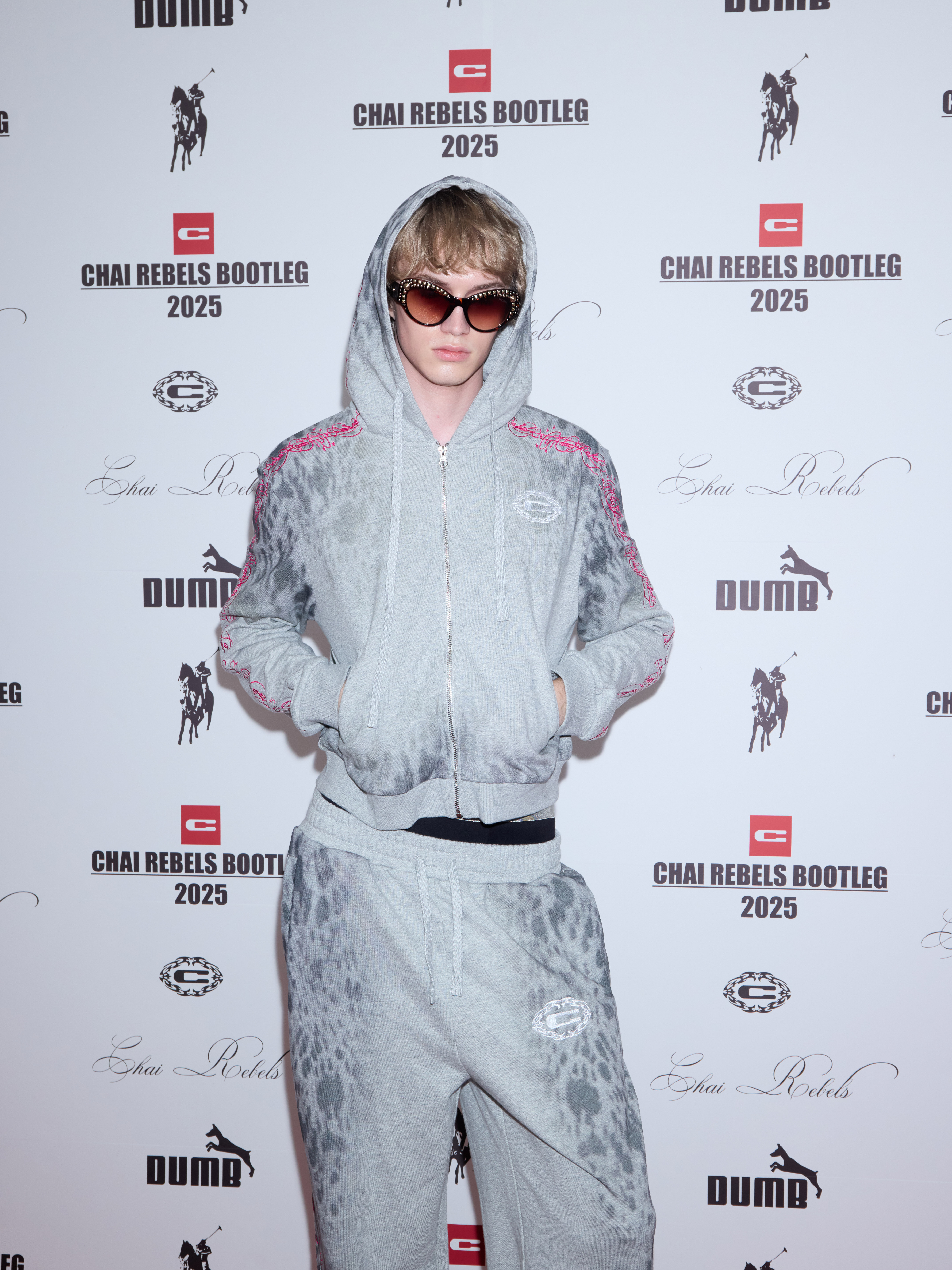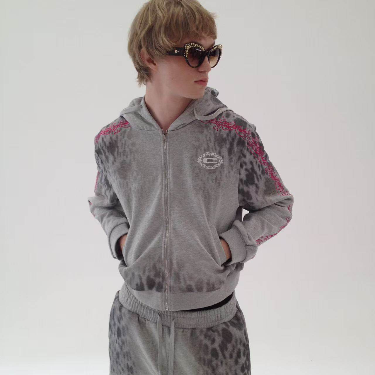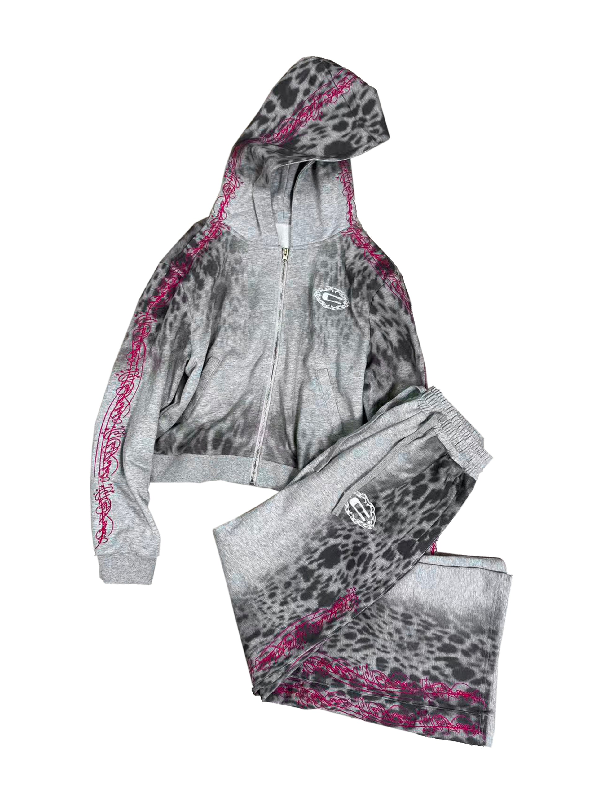 レオパードプリントをベースに、直噴プリントと刺繍ディテールを組み合わせたスウェットセットアップです。