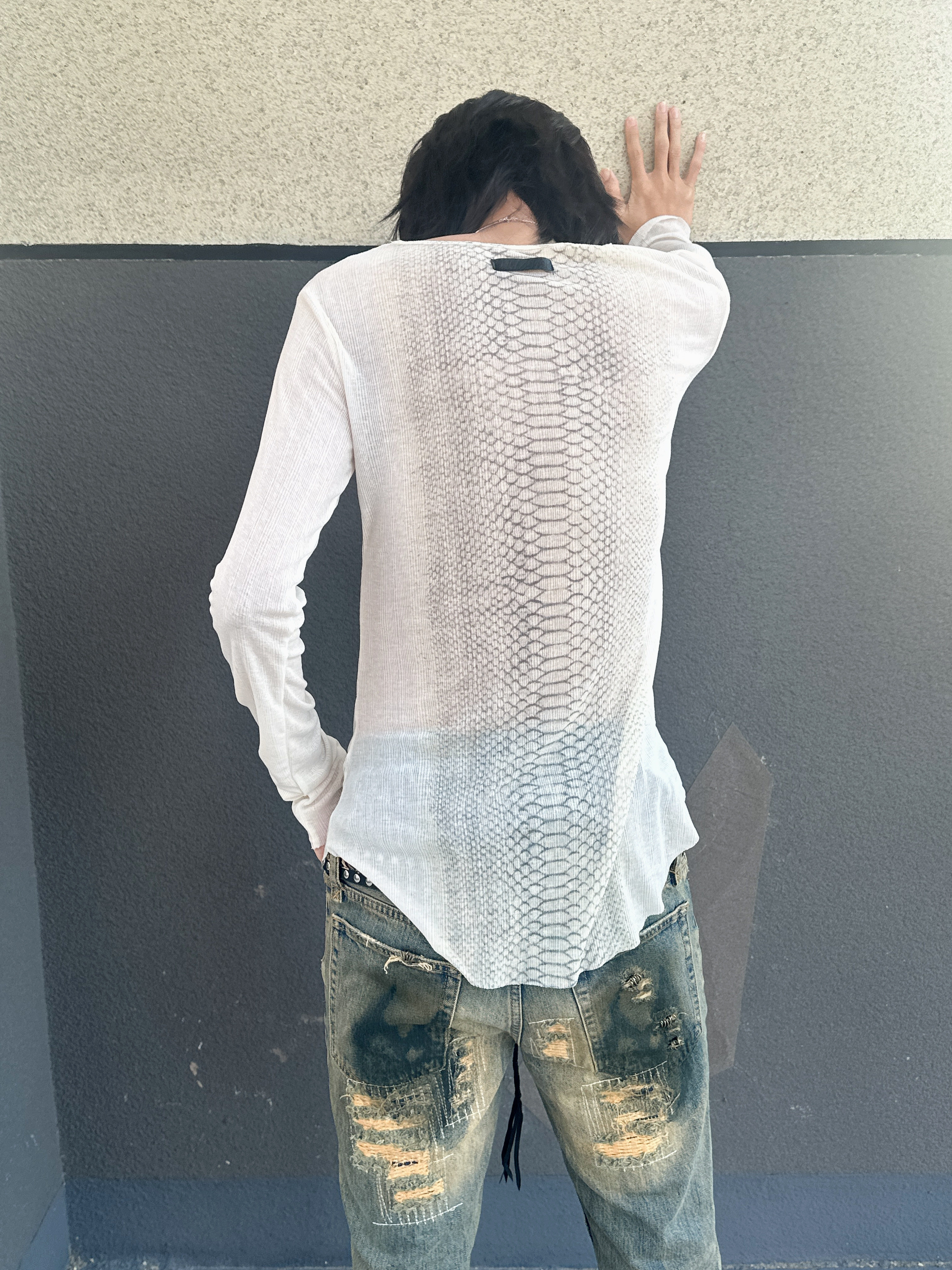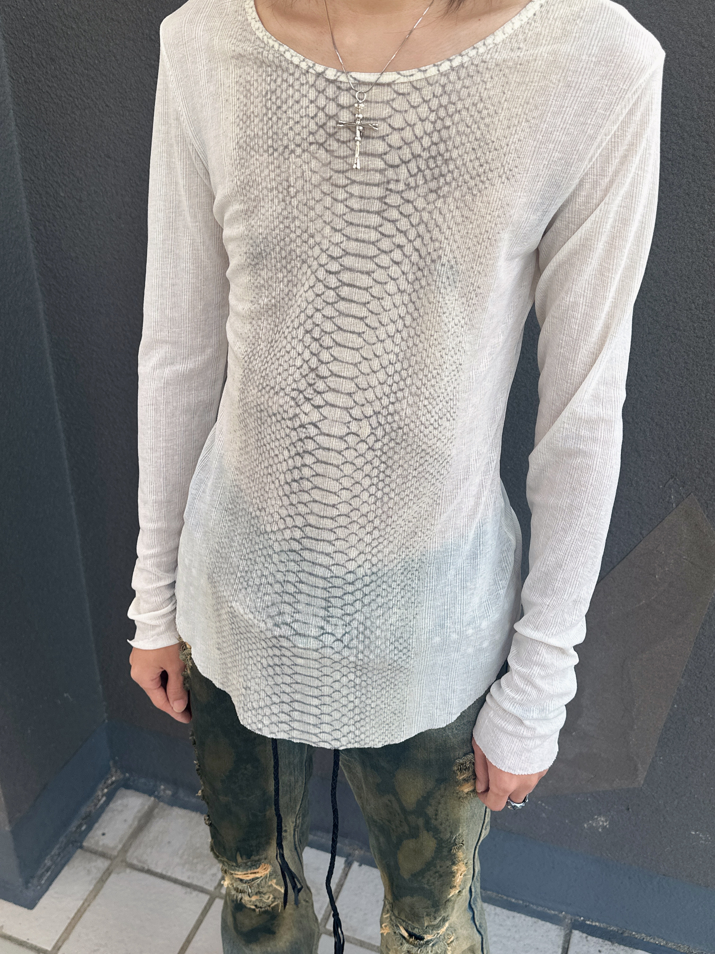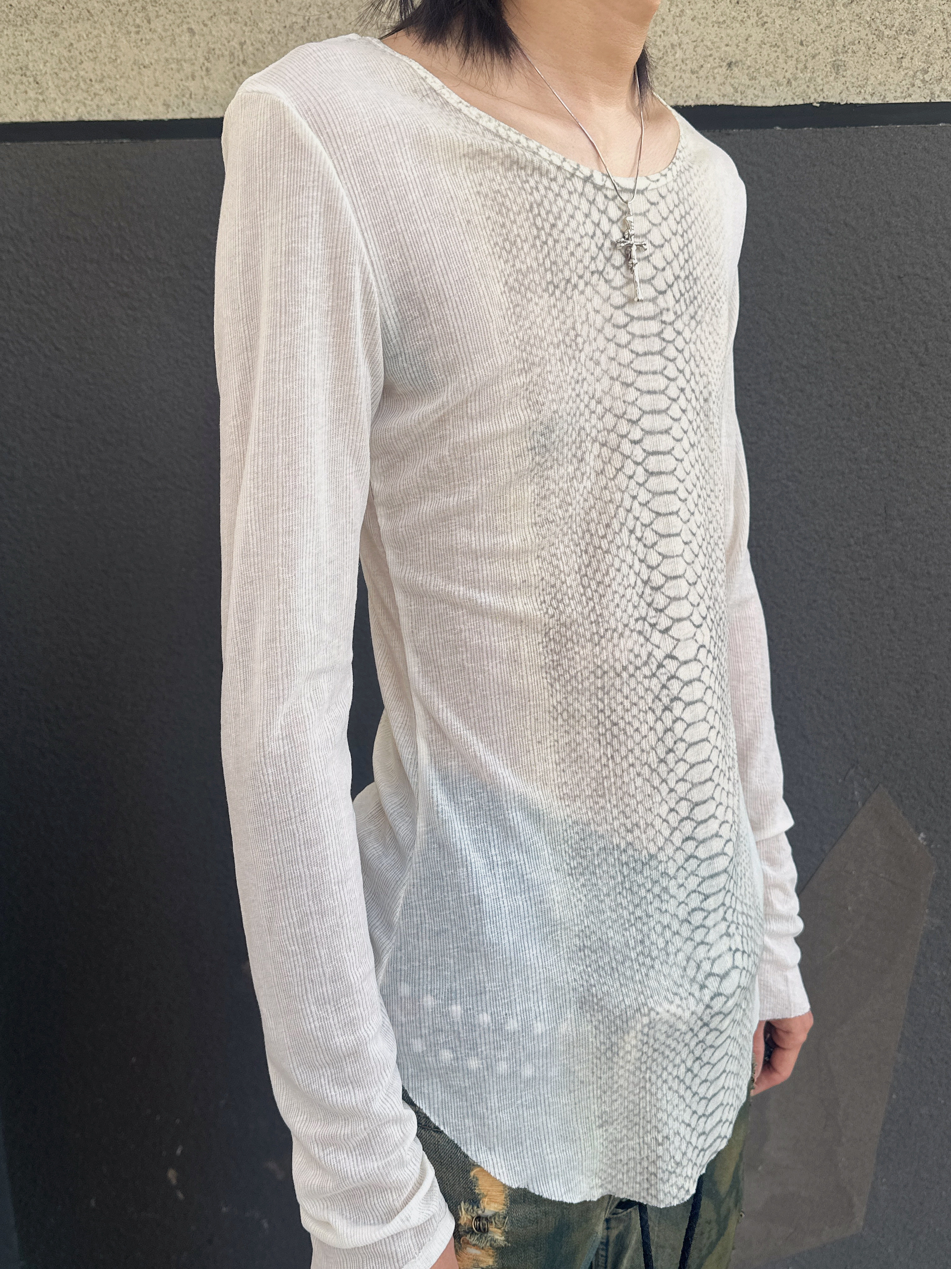 蛇皮調のパイソンパターンを全面に落とし込んだ、ヴィンテージムード漂う長袖Tシャツです。