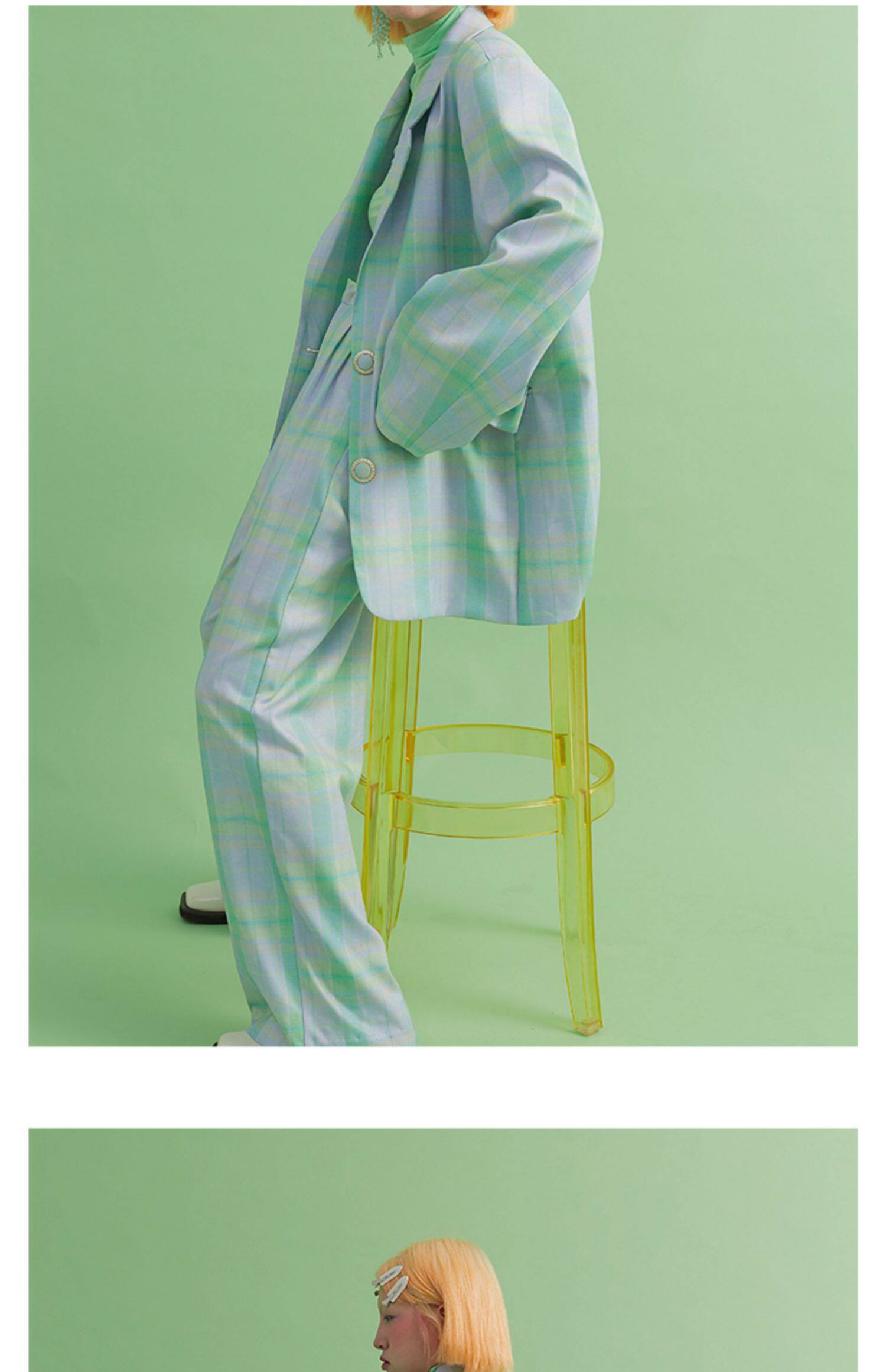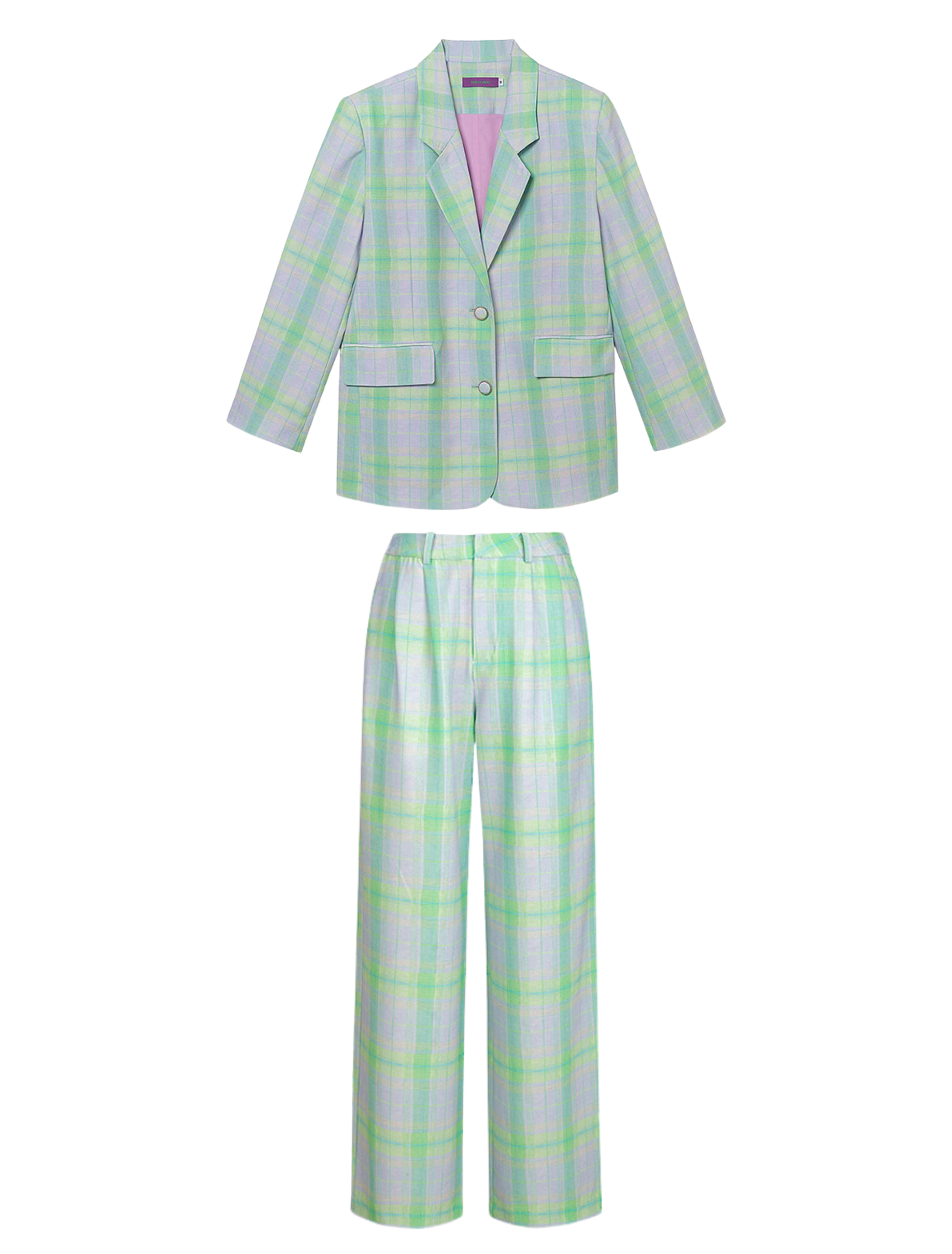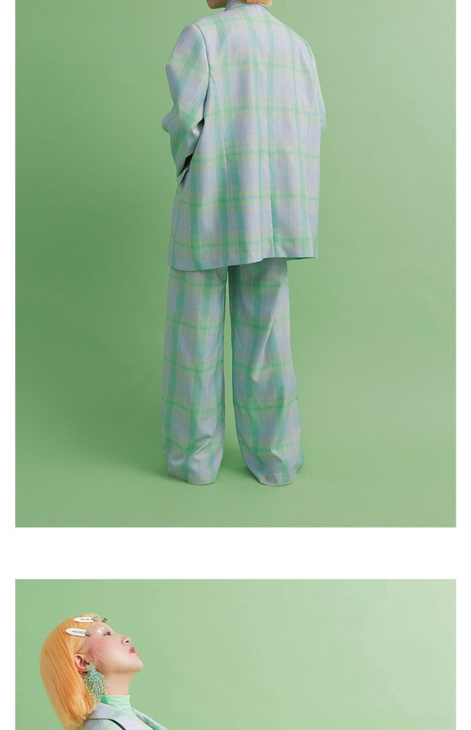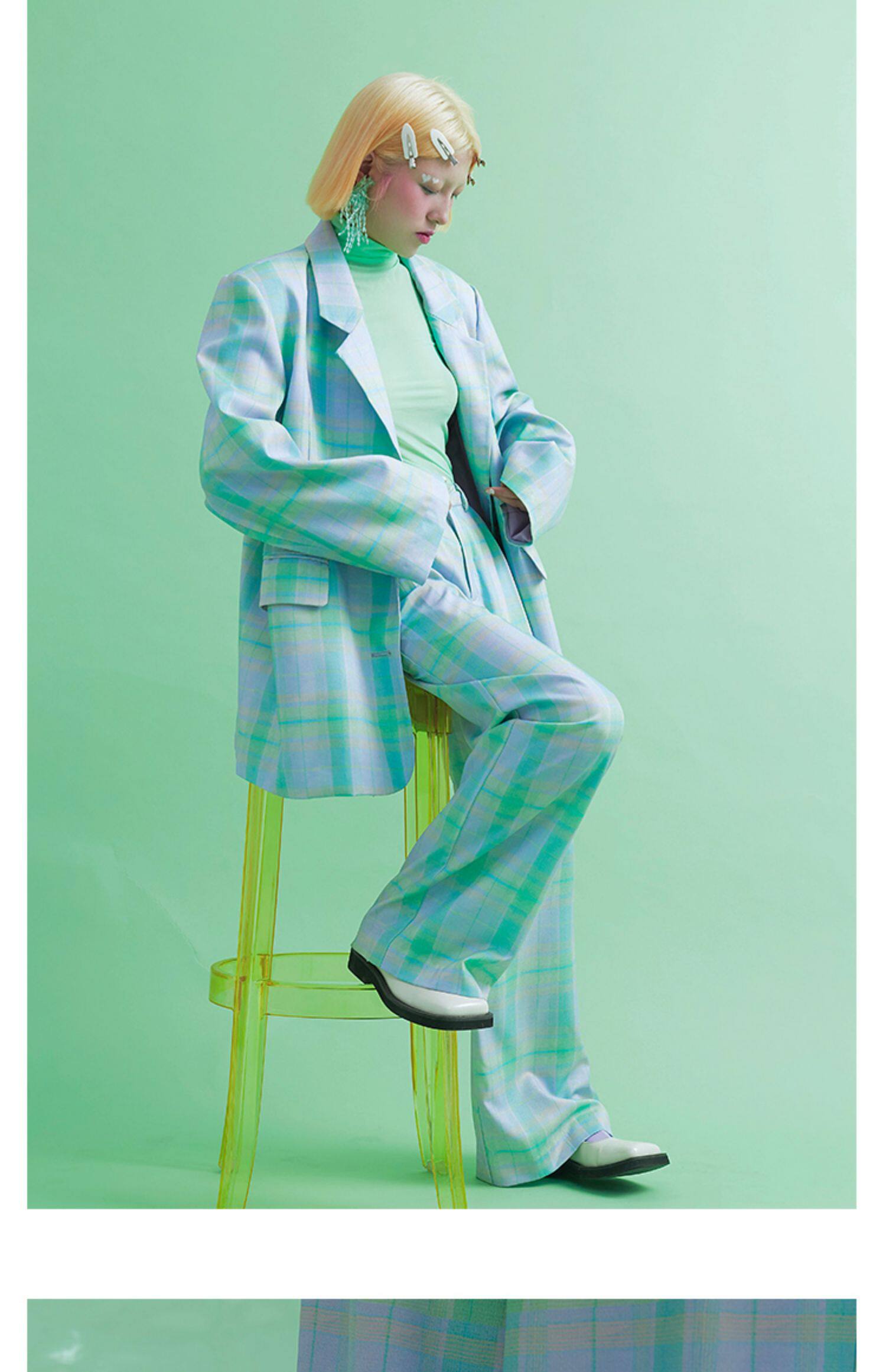 グリーンチェック柄が印象的な、レトロムード漂うルーズシルエットのスーツセットです。